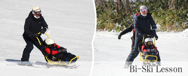 Bi-Ski is an assistive device for skiing, with skis fixed to a seat.